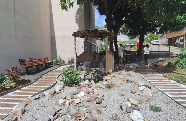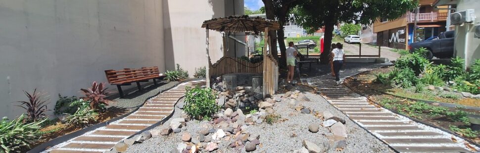Au centre-ville du Diamant, ville située au sud de la Martinique, une place entourée d’immeubles a été transformée en îlot de fraîcheur. Cette place, déjà utilisée par les habitants pour se réunir, était peu aménagée, et les inondations y étaient récurrentes. Entre 2024 et 2025, le site s’est totalement métamorphosé en un jardin partagé. Les couvertures végétales permettent désormais une meilleure infiltration des eaux pluviales, et la biodiversité locale a été renforcée grâce à différentes plantations. De plus, les manguiers existants ont été conservés, mais le feuillage a été partiellement dégagé, permettant une meilleure circulation de l’air. Ce choix permet d’une part de préserver le patrimoine végétal du site mais aussi de réduire fortement la sensation de chaleur. Mieux encore, un bassin aménagé en roches, agrémenté d’une fontaine a été construit afin de rafraîchir davantage les lieux. Pour construire et végétaliser le site, la dalle de béton existante a été cassée : un travail de longue haleine, qui a nécessité des équipements supplémentaires, mais qui participe à la désimperméabilisation des sols.