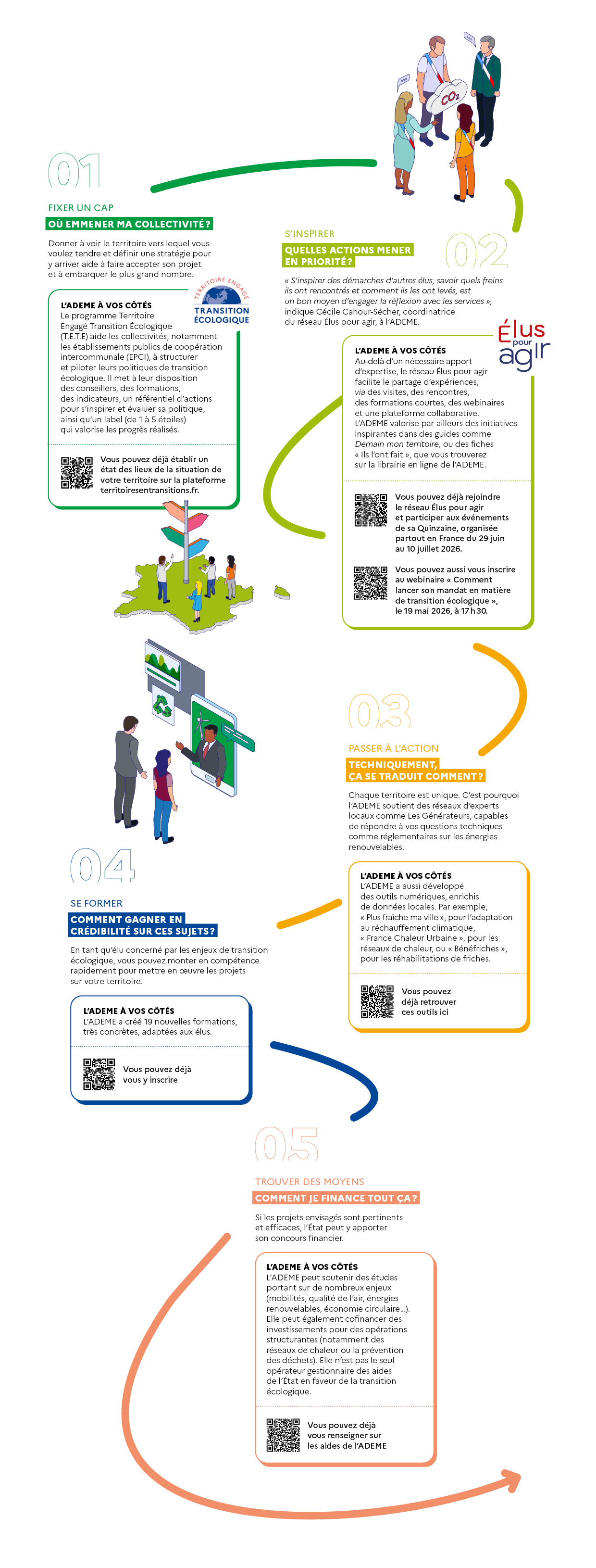 À chaque collectivité sa transition écologique. Celle-ci doit refléter les priorités des élus, répondre aux préoccupations des habitants, tirer parti des ressources du territoire et tenir compte des freins locaux potentiels. Mais par où commencer ? Comment s’y prendre ? Avec quels moyens ? L’ADEME vous accompagne pas à pas.